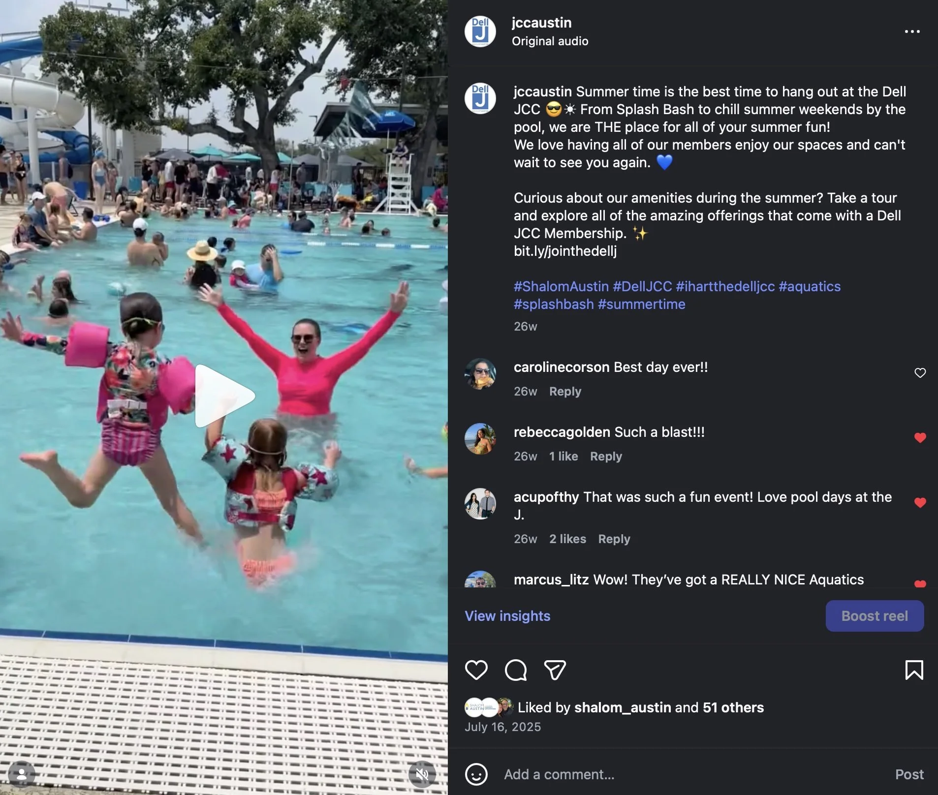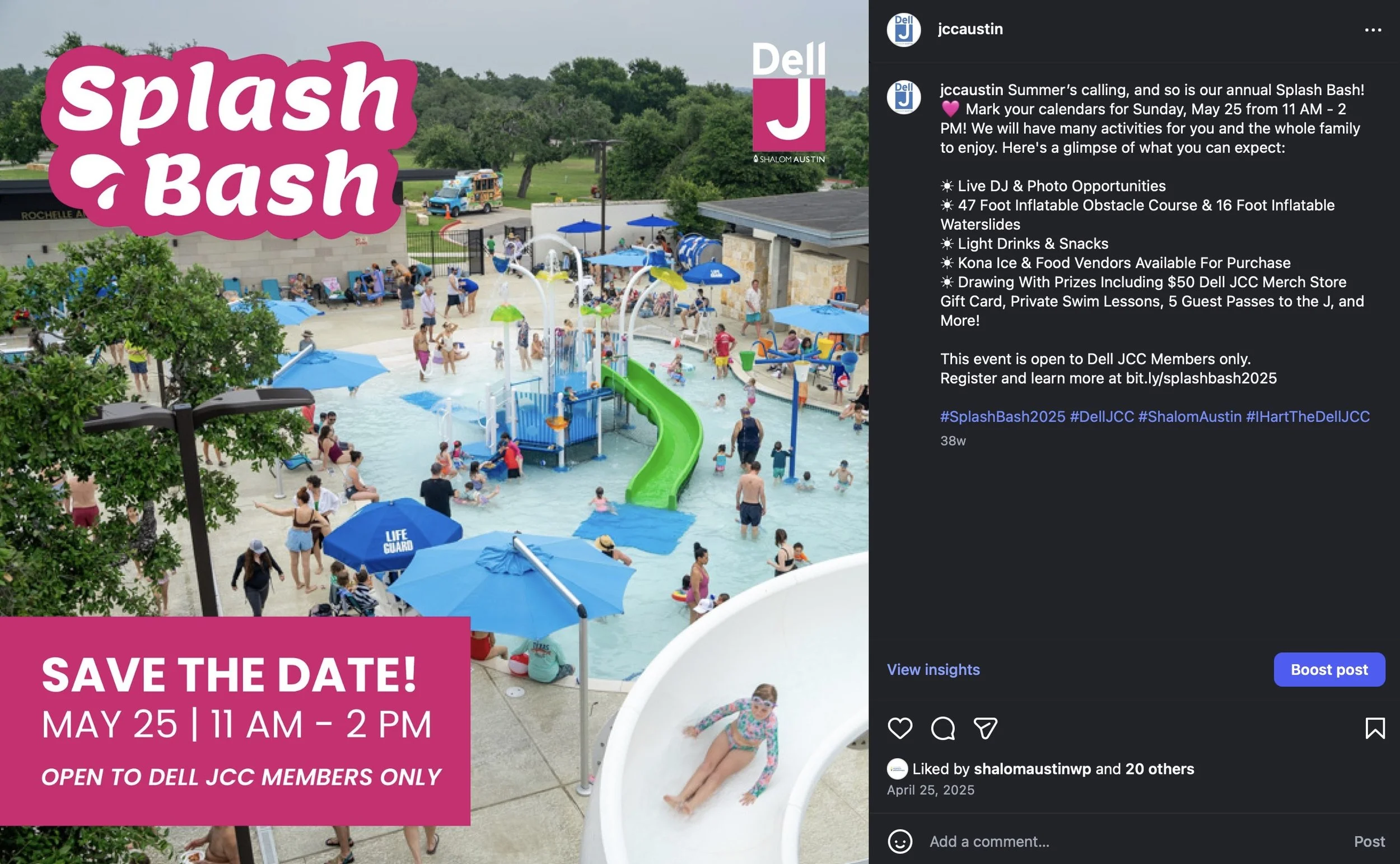 Splash Bash is the Dell JCC’s annual pool party for all members and their friends and families to enjoy! The event features many aquatic activities as well as food, giveaways and much more. This event is one of the Dell JCC’s Member Appreciation Events and aims to give back to members in a fun and engaging way. Our biggest goal was to scale the event larger and increase the amount of participants as well as increase online engagement and feedback.